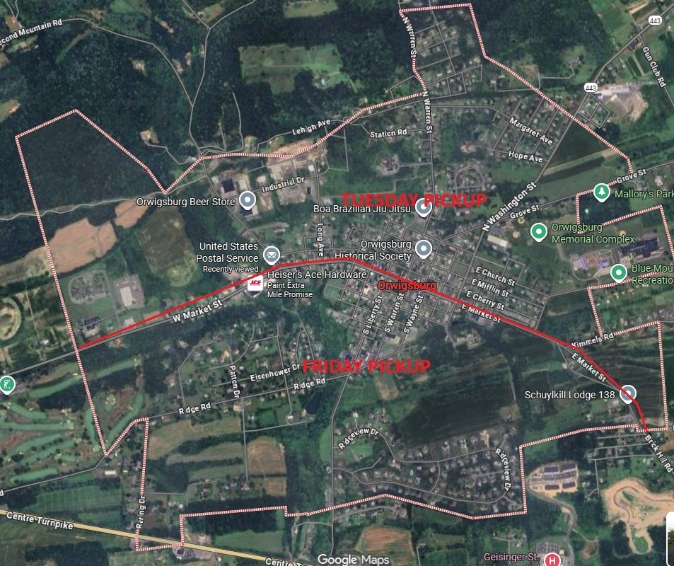 - Where can I get future updates? The chart as well as the latest County Waste pick-up schedule are available at the Borough office as well as on the Orwigsburg Borough web site. Check from time to time for updates.