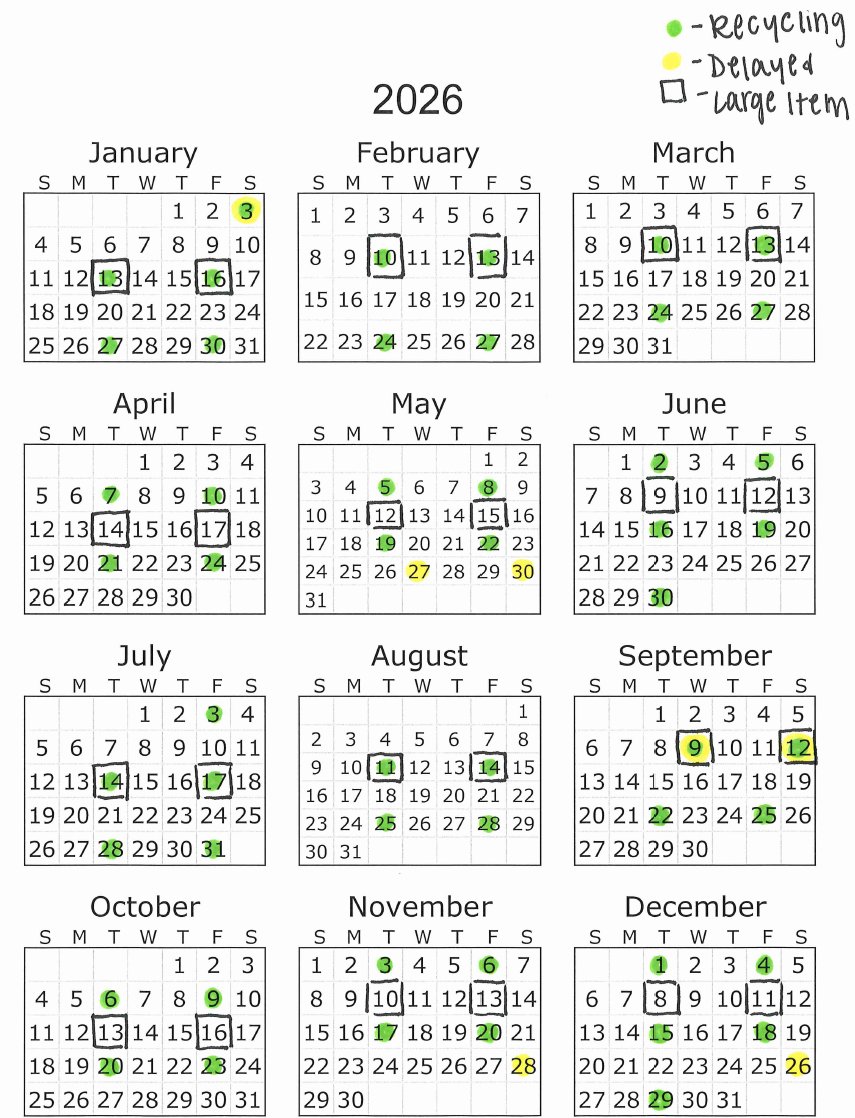 One large item may be place at the curb beside your regular trash per month. The collection date is the second Tuesday & Friday of each month. Please place trash at the curb anytime after 6 p.m. on evenings prior to collection.