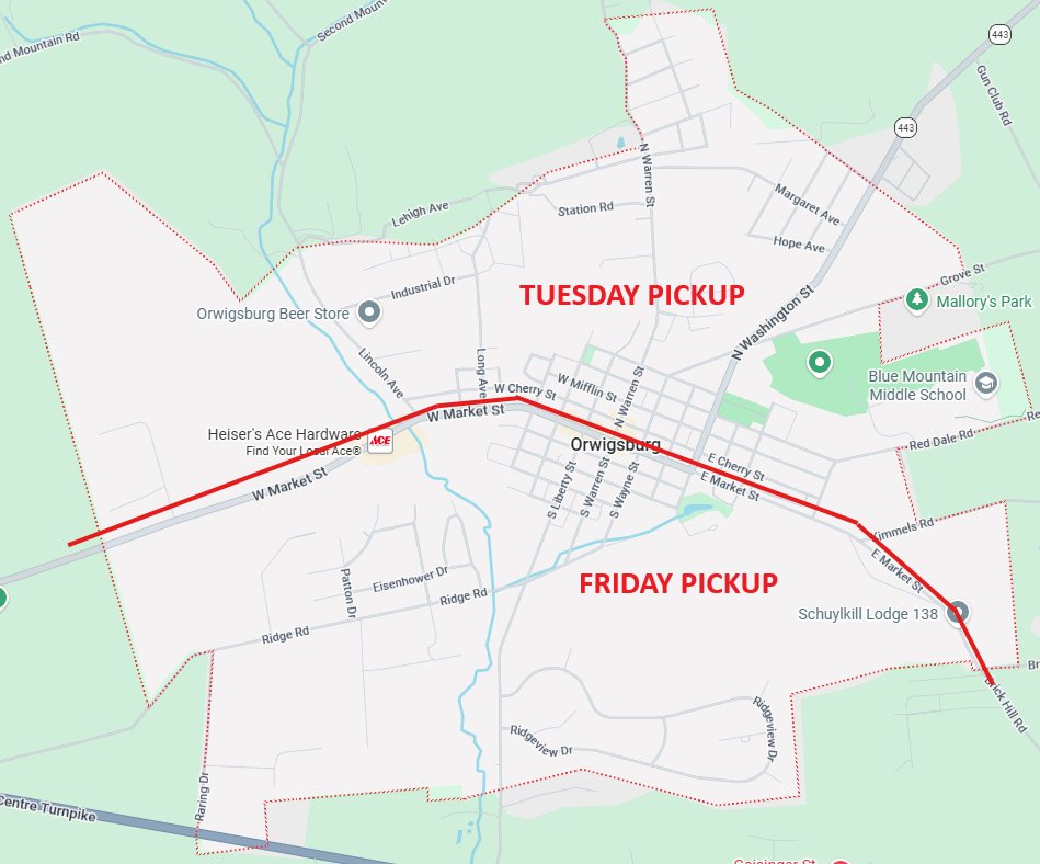 Construction materials may not be placed at the curb with your regular trash. You must get a dumpster for all construction items. You can apply for a dumpster permit at the Borough office or access the form online under the Government-Forms section of our website.